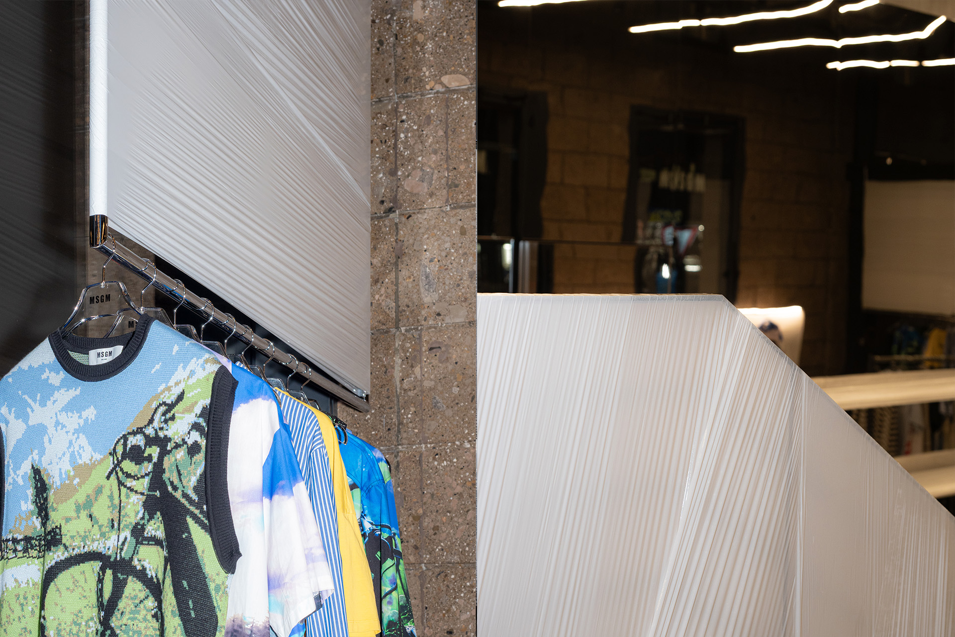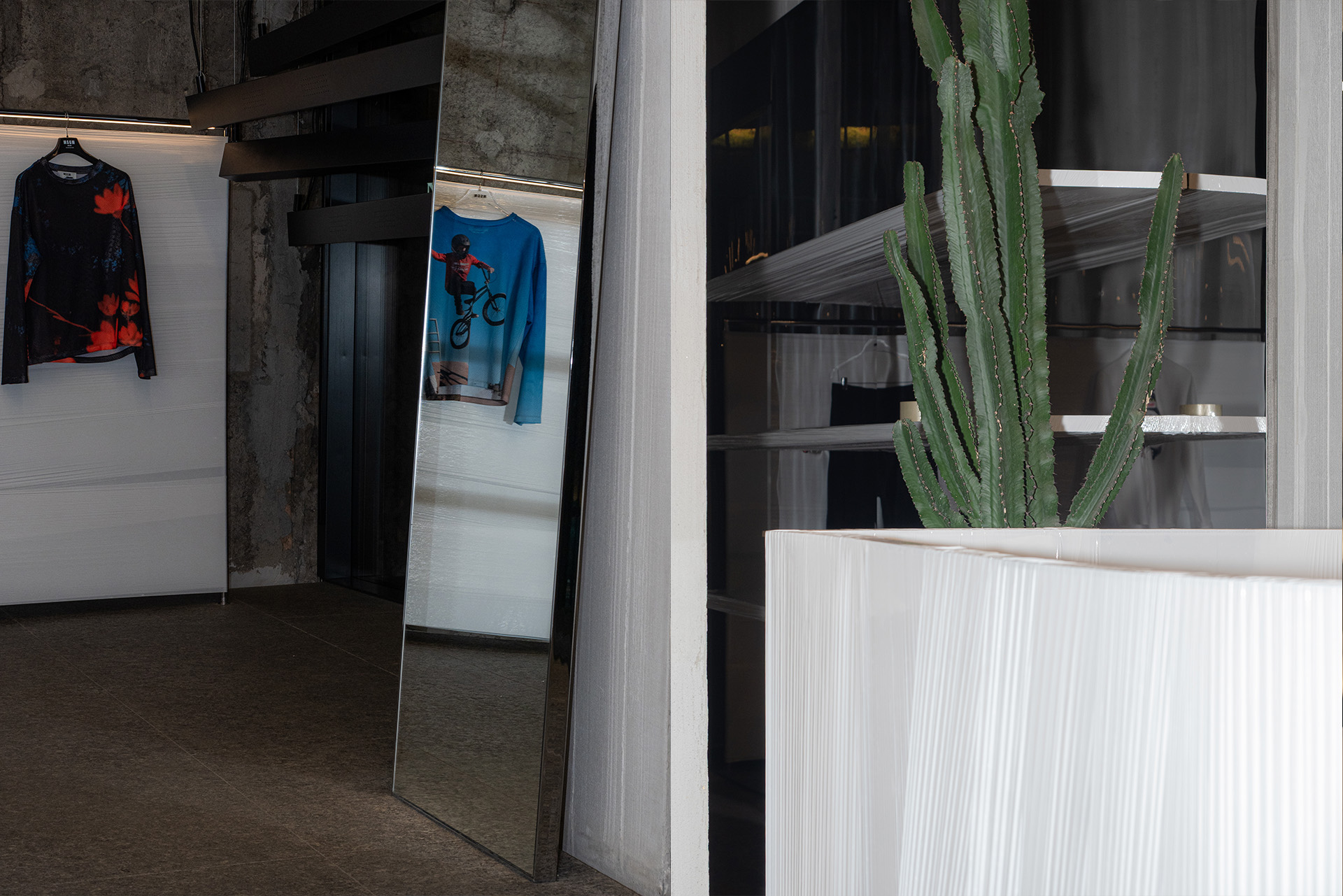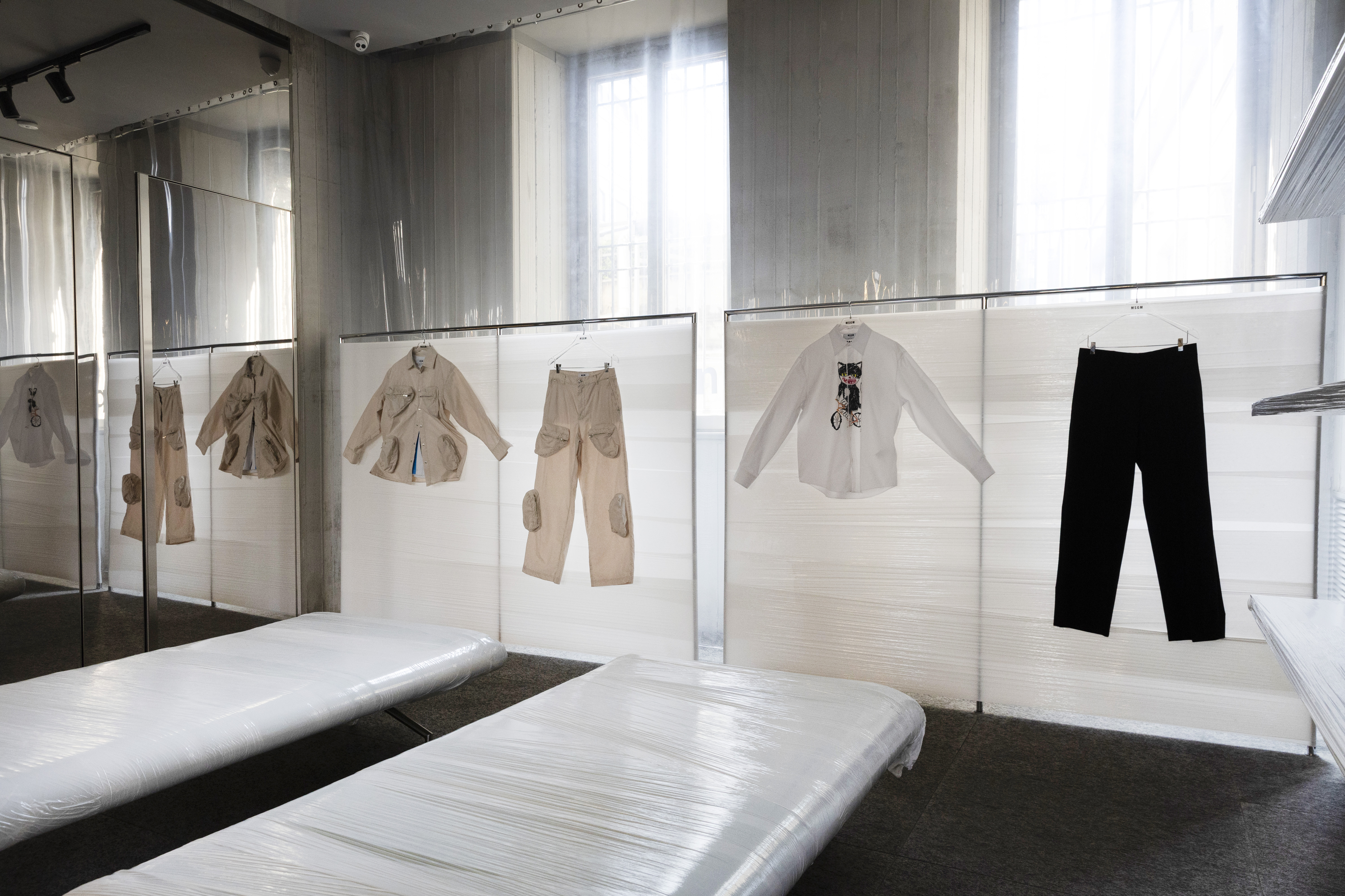 For its Men’s SS26 collection, MSGM takes over its flagship store on Via Broletto, radically paring the space back to its bare essence. Every object is concealed, allowing the architecture to recede and the collection to come fully into focus. In this stripped-back setting, the garments engage in a dynamic and immersive dialogue with the store’s raw materials, proportions, and surfaces, transforming the space into a charged backdrop that amplifies the collection’s energy, textures, and visual impact.