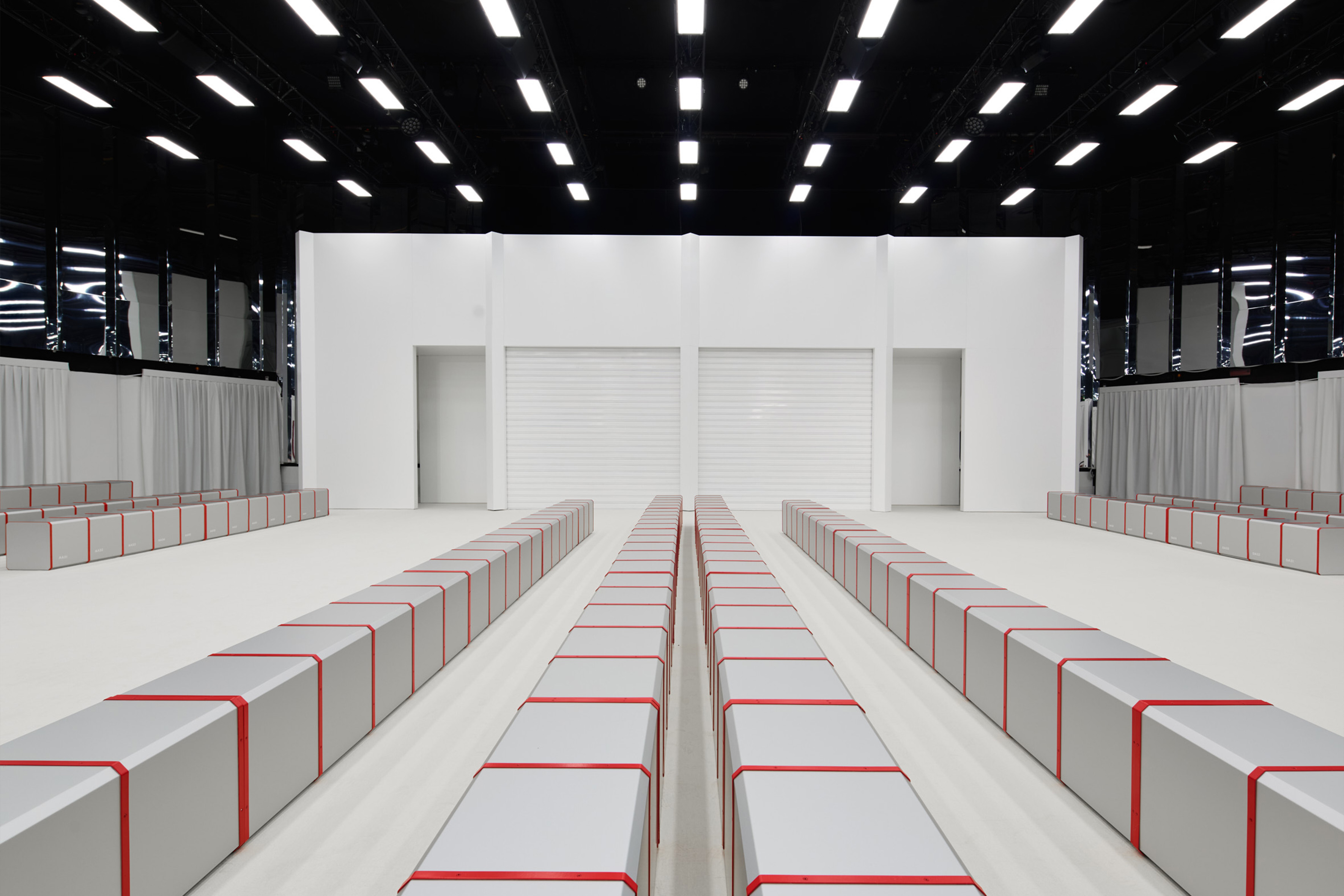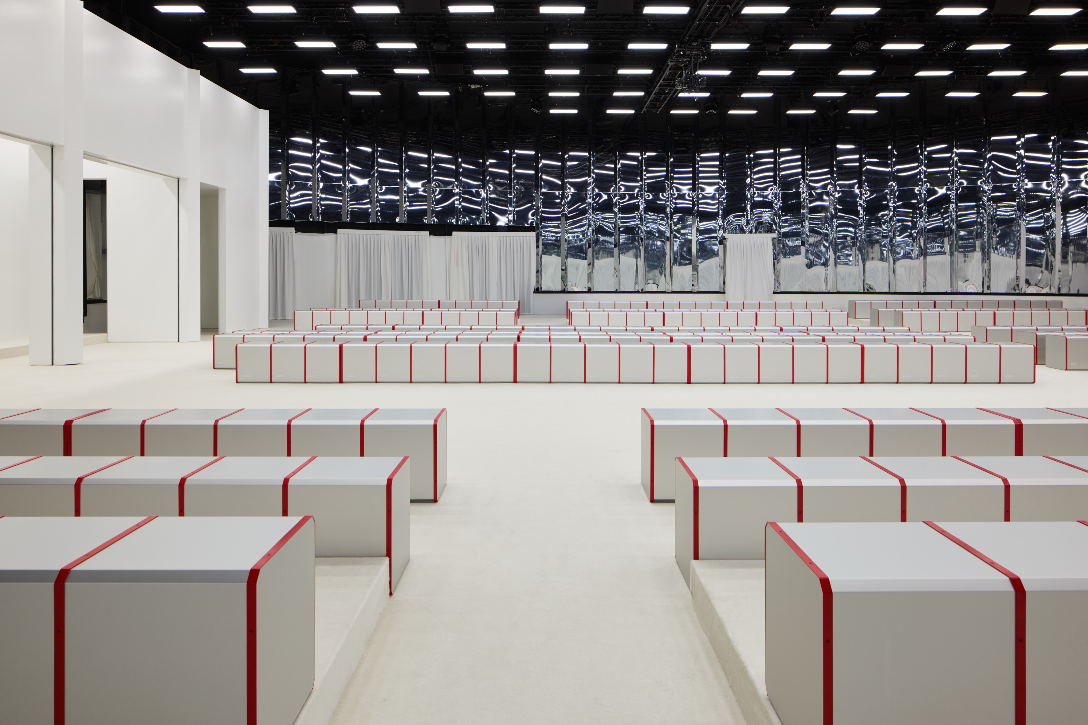 The show environment is delineated by two opposing circular walls that simultaneously define the seating arrangement and the runway. Within this configuration, models traverse the space in a serpentine sequence, guided by a choreography of concentric circles.