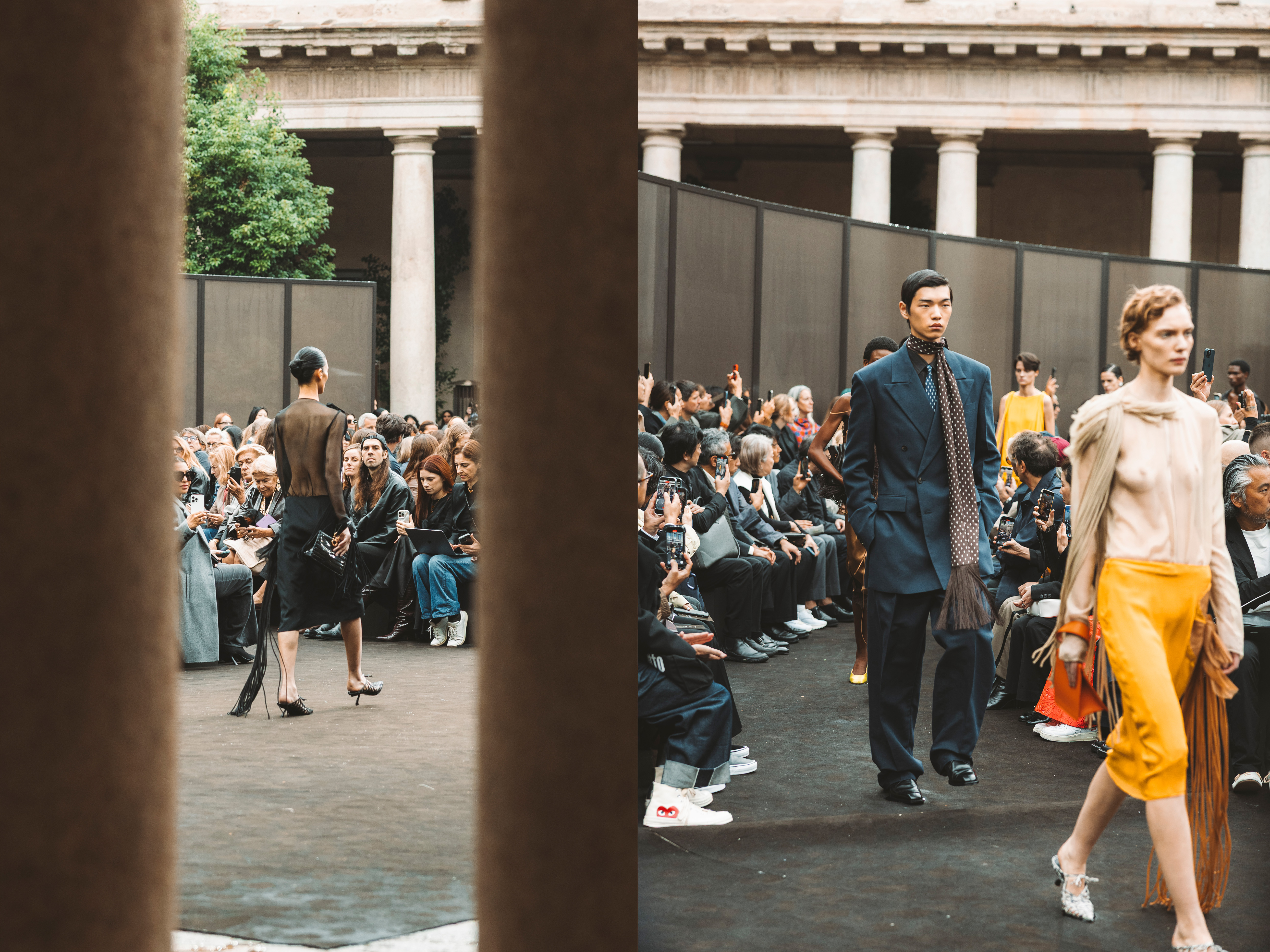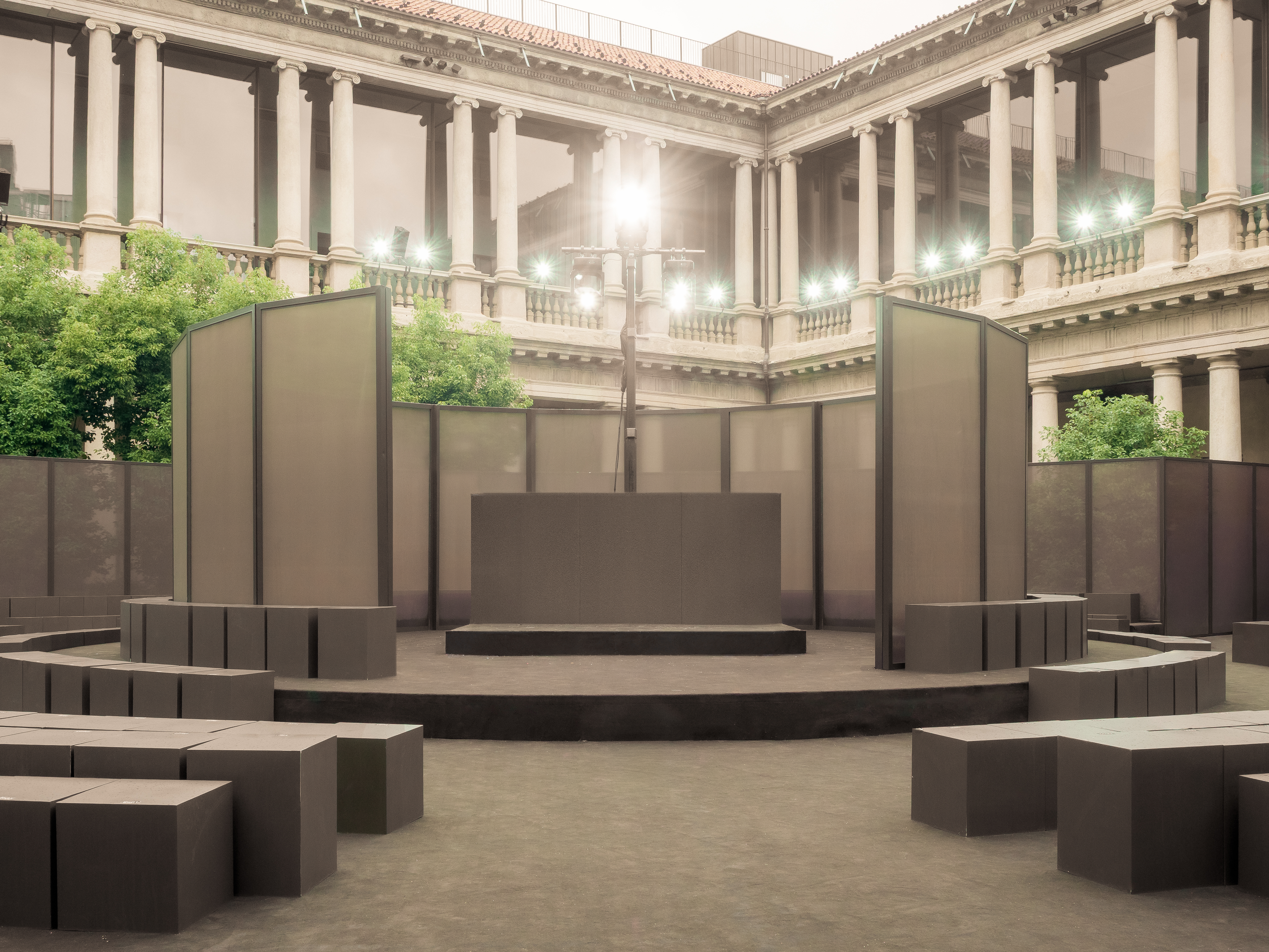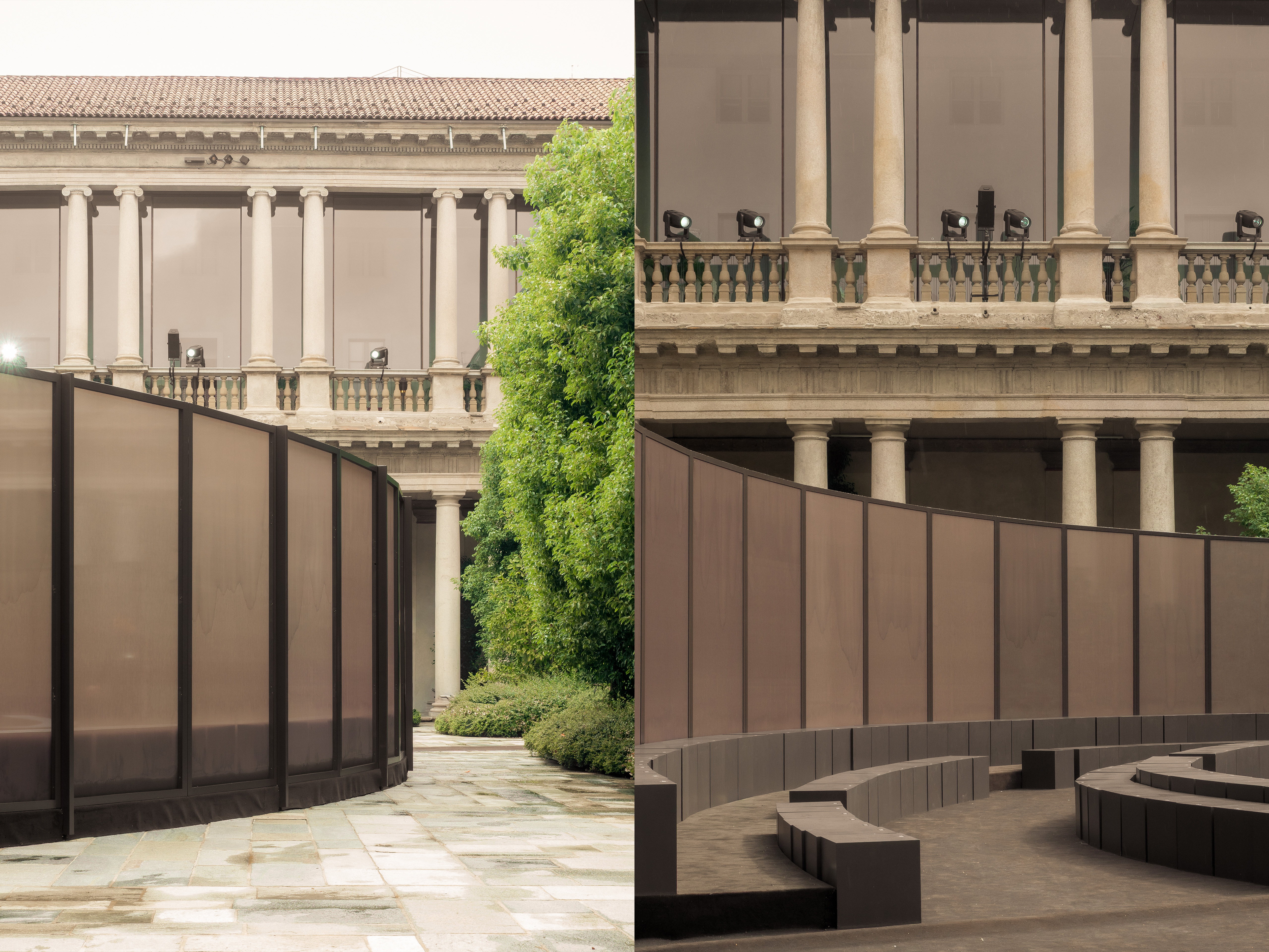 The SS26 Ferragamo Fashion Show presents a refined reinterpretation of a recurring spatial motif emblematic of the brand’s recent presentations: the use of circular geometry. This design language is thoughtfully harmonized with the architectural context of the courtyard at the Portrait Hotel, formerly the Seminario Arcivescovile in Milan.