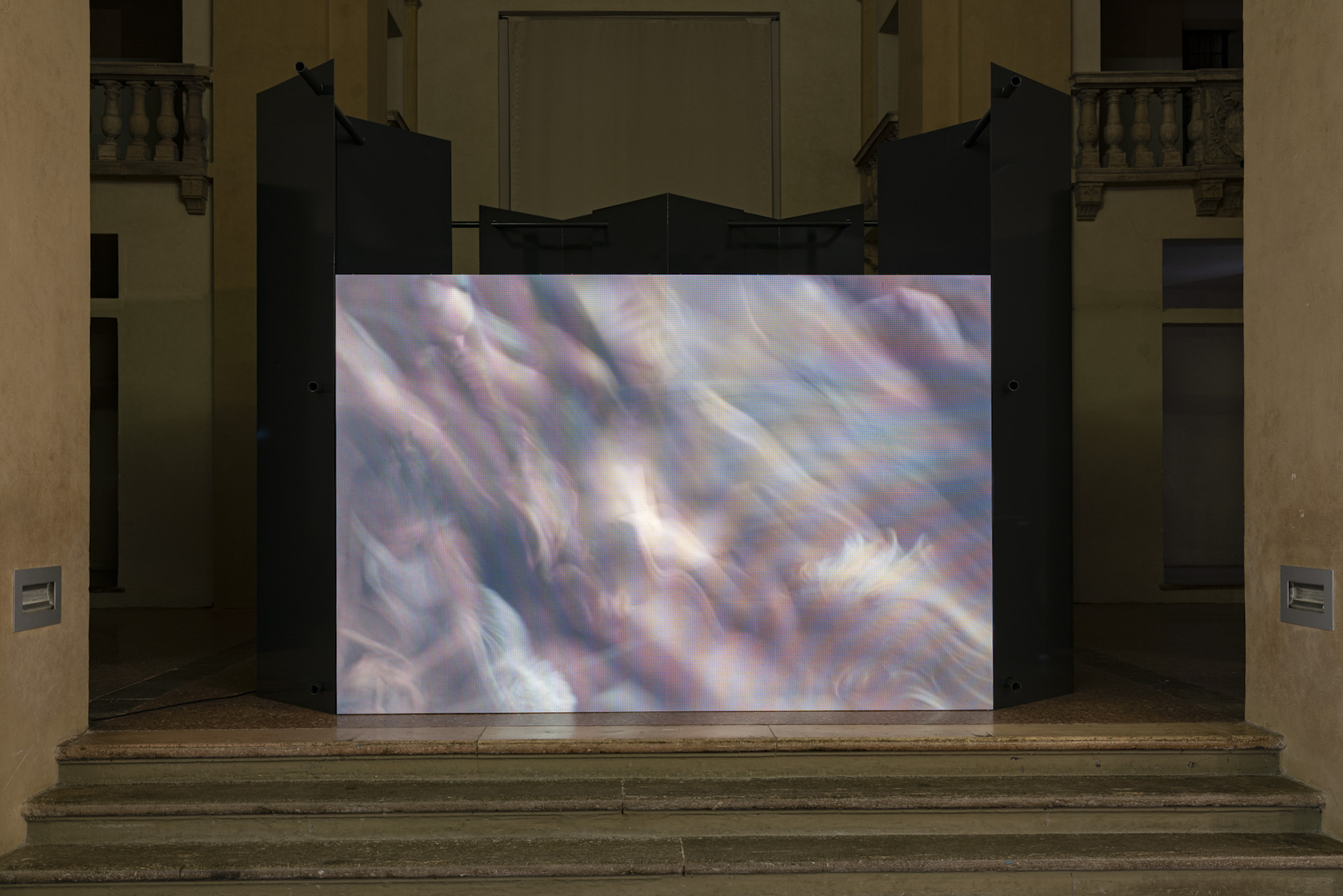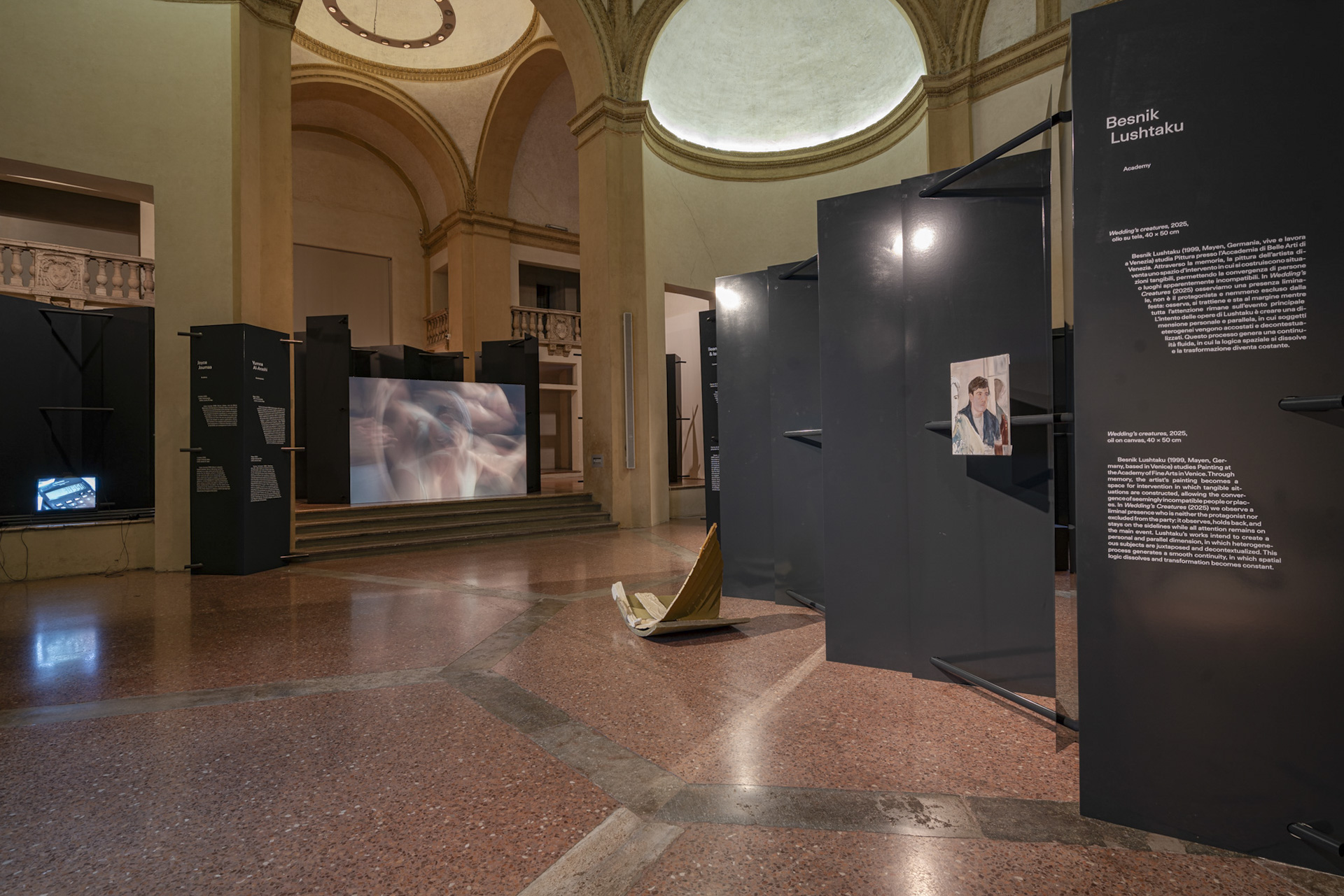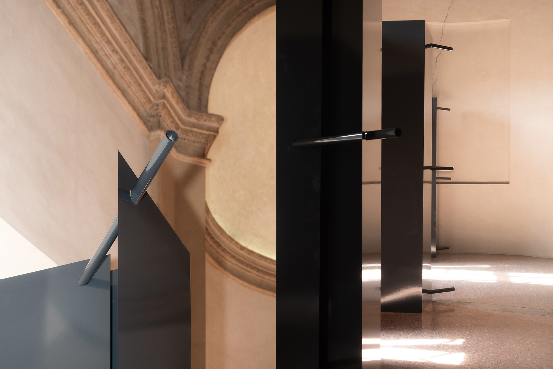 Built in the seventeenth century, the Ducal Chapel is one of the most prestigious spaces within Palazzo Farnese in Piacenza. Its original square plan, transformed into an octagon through the addition of four corner apses, gives rise to a striking double-height hall with a powerful scenographic presence. Engaging in dialogue with this exceptional setting and enhancing its monumental character, the exhibition project proposed for the Ducato Prize 2025 adopts a strategy of contrast. Dark, stereometric volumes are introduced, echoing and reinforcing the austere identity of Palazzo Farnese. The installation is conceived as a monomaterial system, entirely constructed from a single basic element: a steel sheet bent at a 90-degree angle. This module is developed into a series of self-supporting exhibition structures, assembled through interlocking joints and simple tubular elements. Taking the form of screens, partitions, and enclosures, these structures accommodate the artworks and their diverse supports—paintings, monitors, LED walls, and wooden elements. The displays are arranged in a fluid layout that guides visitors along a continuous path, punctuated by visual and sonic episodes.